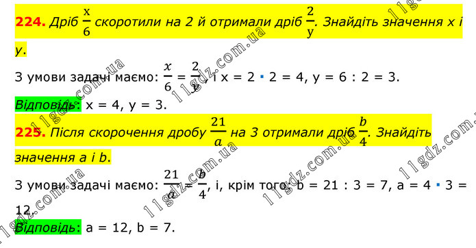 224. Дріб х/6 скоротили на 2 й отримали дріб 2/у. Знайдіть значення х і у. З умови задачі маємо: x/6 = 2/y , і х = 2 ∙ 2 = 4, у = 6 : 2 = 3. Відповідь: х = 4, у = 3. 225. Після скорочення дробу 21/a на 3 отримали дріб b/4. Знайдіть значення а і b. З умови задачі маємо: 21/a = b/4, і, крім того: b = 21 : 3 = 7, а = 4 ∙ 3 = 12. Відповідь: а = 12, b = 7.