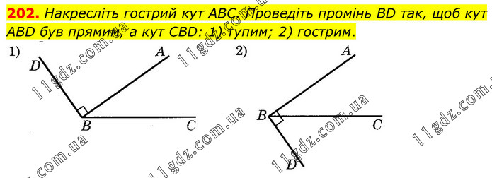 Накресліть гострий кут ABC. Проведіть промінь BD так, щоб кут ABD був прямим, а кут CBD: 1) тупим; 2) гострим.
