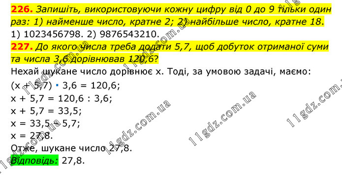 226. Запишіть, використовуючи кожну цифру від 0 до 9 тільки один раз: 1) найменше число, кратне 2; 2) найбільше число, кратне 18. 1) 1023456798. 2) 9876543210. 227. До якого числа треба додати 5,7, щоб добуток отриманої суми та числа 3,6 дорівнював 120,6? Нехай шукане число дорівнює х. Тоді, за умовою задачі, маємо: (х + 5,7) ∙ 3,6 = 120,6; х + 5,7 = 120,6 : 3,6; х + 5,7 = 33,5; х = 33,5 – 5,7; х = 27,8. Отже, шукане число 27,8. Відповідь: 27,8.