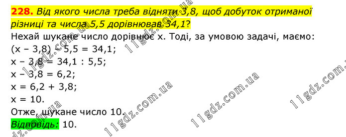 Від якого числа треба відняти 3,8, щоб добуток отриманої різниці та числа 5,5 дорівнював 34,1? Нехай шукане число дорівнює х. Тоді, за умовою задачі, маємо: (х – 3,8) – 5,5 = 34,1; х – 3,8 = 34,1 : 5,5; х – 3,8 = 6,2; х = 6,2 + 3,8; х = 10. Отже, шукане число 10. Відповідь: 10.