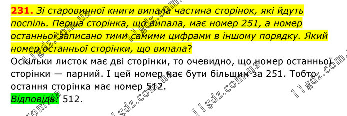 Зі старовинної книги випала частина сторінок, які йдуть поспіль. Перша сторінка, що випала, має номер 251, а номер останньої записано тими самими цифрами в іншому порядку. Який номер останньої сторінки, що випала? Оскільки листок має дві сторінки, то очевидно, що номер останньої сторінки — парний. І цей номер має бути більшим за 251. Тобто остання сторінка має номер 512. Відповідь: 512.
