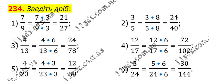 Зведіть дріб: 1) 7/9 = (7 • 3)/(9 • 3) = 21/27; 2) 3/5 = (3 • 8)/(5 • 8) = 24/40; 3) 4/13 = (4 • 6)/(13 • 6) = 24/78; 4) 12/17 = (12 • 6)/(17 • 6) = 72/102; 5) 4/23 = (4 • 3)/(23 • 3) = 12/69; 6) 5/24 = (5 • 6)/(24 • 6) = 30/144.