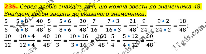 Серед дробів знайдіть такі, що можна звести до знаменника 48. Знайдені дроби зведіть до вказаного знаменника. 5/6 = (5 • 8)/(6 • 8) = 40/48; 5/8 = (5 • 6)/(8 • 6) = 30/48; 7/16 = (7 • 3)/(16 • 3) = 21/48; 9/24 = (9 • 2)/(24 • 2) = 18/48; 10/12 = (10 • 4)/(12 • 4) = 40/48; 10/3 = (10 • 16)/(3 • 16) = 160/48; 5/4 = (5 • 12)/(4 • 12) = 60/48.