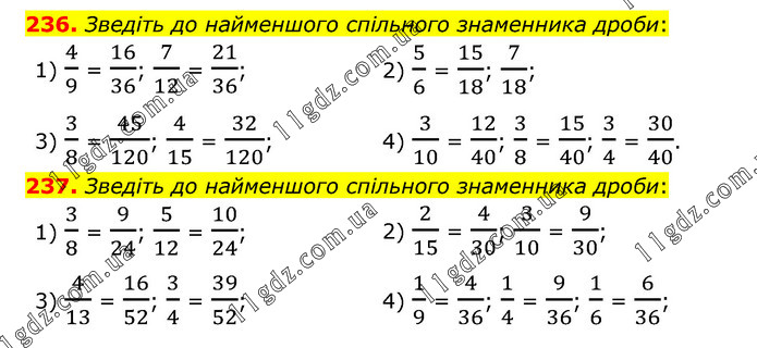 236. Зведіть до найменшого спільного знаменника дроби: 1) 4/9 = 16/36; 7/12 = 21/36; 2) 5/6 = 15/18; 7/18; 3) 3/8 = 45/120; 4/15 = 32/120; 4) 3/10 = 12/40; 3/8 = 15/40; 3/4 = 30/40. 237. Зведіть до найменшого спільного знаменника дроби: 1) 3/8 = 9/24; 5/12 = 10/24; 2) 2/15 = 4/30; 3/10 = 9/30; 3) 4/13 = 16/52; 3/4 = 39/52; 4) 1/9 = 4/36; 1/4 = 9/36; 1/6 = 6/36;
