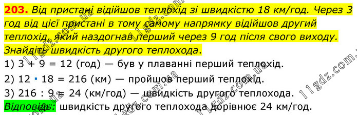 Від пристані відійшов теплохід зі швидкістю 18 км/год. Через 3 год від цієї пристані в тому самому напрямку відійшов другий теплохід, який наздогнав перший через 9 год після свого виходу. Знайдіть швидкість другого теплохода. 1) 3 + 9 = 12 (год) — був у плаванні перший теплохід. 2) 12 ∙ 18 = 216 (км) — пройшов перший теплохід. 3) 216 : 9 = 24 (км/год) — швидкість другого теплохода. Відповідь: швидкість другого теплохода дорівнює 24 км/год.