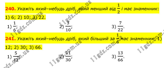 240. Укажіть який–небудь дріб, який менший від 1/2 і має знаменник: 1) 6; 2) 10; 3) 22. 1) 1/6; 2) 3/10; 3) 7/22. 241. Укажіть який–небудь дріб, який більший за 1/6 має знаменник: 1) 12; 2) 30; 3) 66. 1) 5/12; 2) 11/30; 3) 13/66.