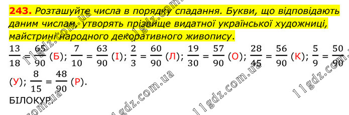 Розташуйте числа в порядку спадання. Букви, що відповідають даним числам, утворять прізвище видатної української художниці, майстрині народного декоративного живопису. 13/18 = 65/90 (Б); 7/10 = 63/90 (І); 2/3 = 60/90 (Л); 19/30 = 57/90 (О); 28/45 = 56/90 (К); 5/9 = 50/90 (У); 8/15 = 48/90 (Р). БІЛОКУР.