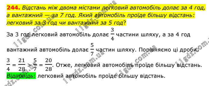 Відстань між двома містами легковий автомобіль долає за 4 год, а вантажний — за 7 год. Який автомобіль проїде більшу відстань: легковий за З год чи вантажний за 5 год? За 3 год легковий автомобіль долає 3/4 частини шляху, а за 4 год вантажний автомобіль долає 5/7 частин шляху. Порівняємо ці дроби: 3/4 = 21/28 > 5/7 = 20/28. Отже, легковий автомобіль проїде більшу відстань. Відповідь: легковий автомобіль проїде більшу відстань.