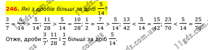 Які з дробів більші за дріб 5/14? 3/7 = 6/14 > 5/14; 11/28 > 5/14 = 10/28; 1/2 = 7/14 > 5/14; 13/42 < 5/14 = 15/42; 23/70 < 5/14 = 25/70. Отже, дроби 3/7, 11/28 і 1/2 більші за дріб 5/14.