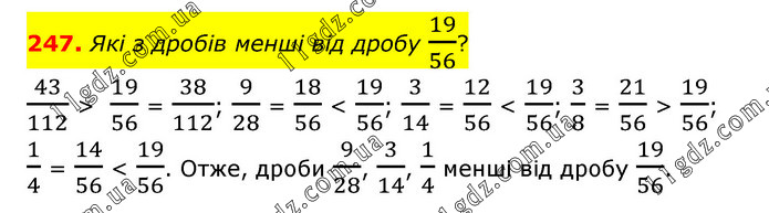 Які з дробів менші від дробу 19/56? 43/112 > 19/56 = 38/112; 9/28 = 18/56 < 19/56; 3/14 = 12/56 < 19/56; 3/8 = 21/56 > 19/56; 1/4 = 14/56 < 19/56. Отже, дроби 9/28, 3/14, 1/4 менші від дробу 19/56.