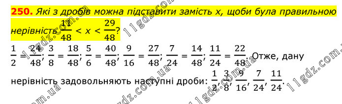 Які з дробів можна підставити замість х, щоби була правильною нерівність 11/48 < x < 29/48? 1/2 = 24/48; 3/8 = 18/48; 5/6 = 40/48; 9/16 = 27/48; 7/24 = 14/48; 11/24 = 22/48. Отже, дану нерівність задовольняють наступні дроби: 1/2, 3/8, 9/16, 7/24, 11/24.