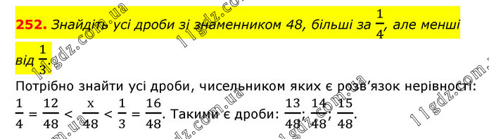 Знайдіть усі дроби зі знаменником 48, більші за 1/4, але менші від 1/3. Потрібно знайти усі дроби, чисельником яких є розв’язок нерівності: 1/4 = 12/48 < х/48 < 1/3 = 16/48. Такими є дроби: 13/48; 14/48; 15/48.