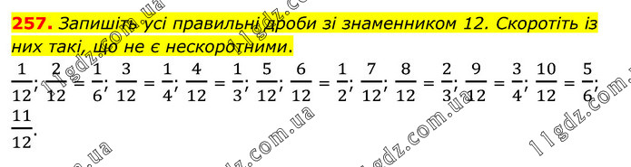 Запишіть усі правильні дроби зі знаменником 12. Скоротіть із них такі, що не є нескоротними. 1/12; 2/12 = 1/6; 3/12 = 1/4; 4/12 = 1/3; 5/12; 6/12 = 1/2; 7/12; 8/12 = 2/3; 9/12 = 3/4; 10/12 = 5/6; 11/12.