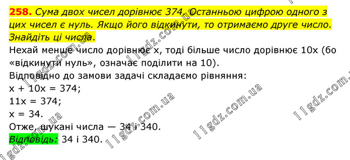 Сума двох чисел дорівнює 374. Останньою цифрою одного з цих чисел є нуль. Якщо його відкинути, то отримаємо друге число. Знайдіть ці числа. Нехай менше число дорівнює х, тоді більше число дорівнює 10х (бо «відкинути нуль», означає поділити на 10). Відповідно до замови задачі складаємо рівняння: х + 10х = 374; 11х = 374; х = 34. Отже, шукані числа — 34 і 340. Відповідь: 34 і 340.