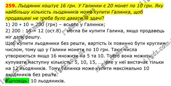 Льодяник коштує 16 грн. У Галинки є 20 монет по 10 грн. Яку найбільшу кількість льодяників може купити Галинка, щоб продавцеві не треба було давати їй здачі? 1) 20 • 10 = 200 (грн) – всього у Галинки; 2) 200 : 16 = 12 (ост.8) – могла би купити Галина, якщо продавець міг дати решту. Щоб купити льодяники без решти, вартість їх повинно бути круглим числом, тому що у Галини монети по 10 грн. Таки числа утворюються якщо 16 множити на 5 та 10. Тобто вона можить купувати наступну кількість: 5, 10, 15, …, але у неї вистачає тільки на 12 льодяників. Тому Галинка може купити максімально 10 льодяників без решти. Відповідь: 10 льодяників.