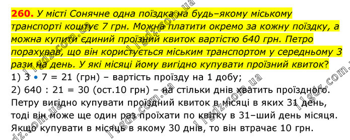 У місті Сонячне одна поїздка на будь–якому міському транспорті коштує 7 грн. Можна платити окремо за кожну поїздку, а можна купити єдиний проїзний квиток вартістю 640 грн. Петро порахував, що він користується міським транспортом у середньому 3 рази на день. У які місяці йому вигідно купувати проїзний квиток? 1) 3 • 7 = 21 (грн) – вартість проїзду на 1 добу; 2) 640 : 21 = 30 (ост.10 грн) – на стільки днів хватить проїздного. Петру вигідно купувати проїздний квиток в місяці в яких 31 день, тоді він може ще один раз проїхати по квітку в 31–ший день місяця. Якщо купувати в місяць в якому 30 днів, то він втрачає 10 грн.