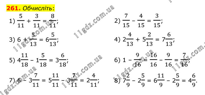 Обчисліть: 1) 5/11 + 3/11 = 8/11; 2) 7/15 – 4/15 = 3/15; 3) 6 + 5/13 = 65/13; 4) 24/13 + 52/13 = 76/13; 5) 411/18 – 15/18 = 36/18; 6) 1 – 9/16 = 16/16 – 9/16 = 7/16; 7) 6 – 37/11 = 511/11 – 37/11 = 24/11; 8) 72/9 – 25/9 = 611/9 – 25/9 = 46/9.
