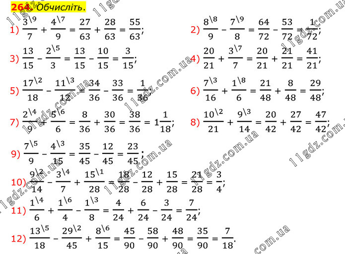 Обчисліть. 1) 3^(\9)/7 + 4^(\7)/9 = 27/63 + 28/63 = 55/63; 2) 8^(\8)/9 – 7^(\9)/8 = 64/72 – 53/72 = 1/72; 3) 13/15 – 2^(\5)/3 = 13/15 – 10/15 = 3/15; 4) 20/21 + 3^(\7)/7 = 20/21 + 21/21 = 41/21; 5) 17^(\2)/18 – 11^(\3)/12 = 34/36 – 33/36 = 1/36; 6) 7^(\3)/16 + 1^(\8)/6 = 21/48 + 8/48 = 29/48; 7) 2^(\4)/9 + 5^(\6)/6 = 8/36 + 30/36 = 38/36 = 11/18; 8) 10^(\2)/21 + 9^(\3)/14 = 20/42 + 27/42 = 47/42; 9) 7^(\5)/9 – 4^(\3)/15 = 35/45 – 12/45 = 23/45; 10) 9^(\2)/14 – 3^(\4)/7 + 15^(\1)/28 = 18/28 – 12/28 + 15/28 = 21/28 = 3/4; 11) 1^(\4)/6 + 1^(\6)/4 – 1^(\3)/8 = 4/24 + 6/24 – 3/24 = 7/24; 12) 13^(\5)/18 – 29^(\2)/45 + 8^(\6)/15 = 45/90 – 58/90 + 48/90 = 35/90 = 7/18.