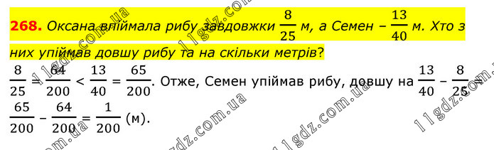 Оксана впіймала рибу завдовжки 8/25 м, а Семен – 13/40 м. Хто з них упіймав довшу рибу та на скільки метрів? 8/25 = 64/200 < 13/40 = 65/200. Отже, Семен упіймав рибу, довшу на 13/40 – 8/25 = 65/200 – 64/200 = 1/200 (м).