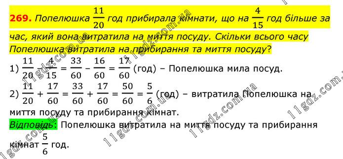 Попелюшка 11/20 год прибирала кімнати, що на 4/15 год більше за час, який вона витратила на миття посуду. Скільки всього часу Попелюшка витратила на прибирання та миття посуду? 1) 11/20 – 4/15 = 33/60 – 16/60 = 17/60 (год) – Попелюшка мила посуд. 2) 11/20 + 17/60 = 33/60 + 17/60 = 50/60 = 5/6 (год) – витратила Попелюшка на миття посуду та прибирання кімнат. Відповідь: Попелюшка витратила на миття посуду та прибирання кімнат 5/6 год.