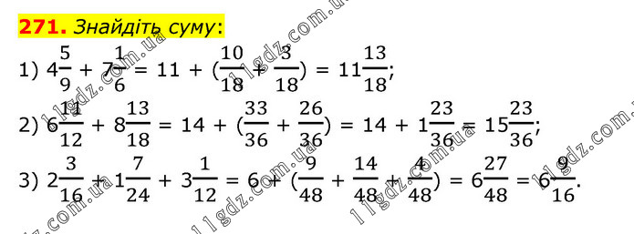 Знайдіть суму: 1) 45/9 + 71/6 = 11 + (10/18 + 3/18) = 1113/18; 2) 611/12 + 813/18 = 14 + (33/36 + 26/36) = 14 + 123/36 = 1523/36; 3) 23/16 + 17/24 + 31/12 = 6 + (9/48 + 14/48 + 4/48) = 627/48 = 69/16.