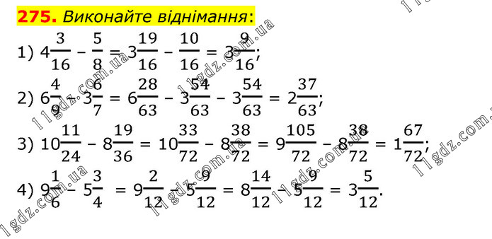 Виконайте віднімання: 1) 43/16 – 5/8 = 319/16 – 10/16 = 39/16; 2) 64/9 – 36/7 = 628/63 – 354/63 – 354/63 = 237/63; 3) 1011/24 – 819/36 = 1033/72 – 838/72 = 9105/72 – 838/72 = 167/72; 4) 91/6 – 53/4 = 92/12 – 59/12 = 814/12 – 59/12 = 35/12.