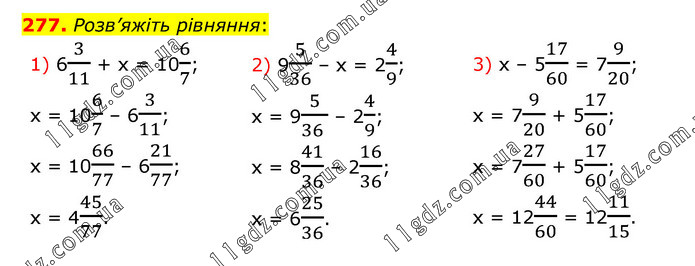 Розв’яжіть рівняння: 1) 63/11 + х = 106/7; х = 106/7 – 63/11; х = 1066/77 – 621/77; х = 445/77. 2) 95/36 – х = 24/9; х = 95/(36 ) – 24/9; х = 841/36 – 216/36; х = 625/36. 3) х – 517/60 = 79/20; х = 79/20 + 517/60; х = 727/60 + 517/60; х = 1244/60 = 1211/15.