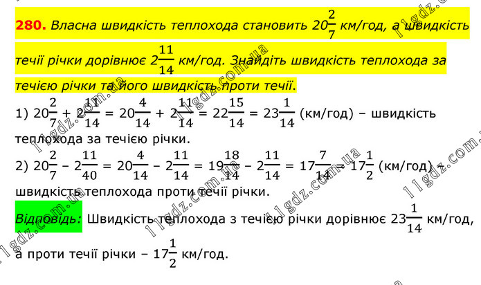 Власна швидкість теплохода становить 202/7 км/год, а швидкість течії річки дорівнює 211/14 км/год. Знайдіть швидкість теплохода за течією річки та його швидкість проти течії. 1) 202/7 + 211/14 = 204/14 + 211/14 = 2215/14 = 231/14 (км/год) – швидкість теплохода за течією річки. 2) 202/7 – 211/40 = 204/14 – 211/14 = 1918/14 – 211/14 = 177/14 = 171/2 (км/год) – швидкість теплохода проти течії річки. Відповідь: Швидкість теплохода з течією річки дорівнює 231/14 км/год, а проти течії річки – 171/2 км/год.