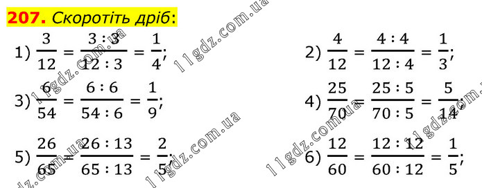 Скоротіть дріб: 1) 3/12 = (3 ∶ 3)/(12 ∶ 3 ) = 1/4; 2) 4/12 = (4 ∶ 4)/(12 ∶ 4) = 1/3; 3) 6/54 = (6 ∶ 6)/(54 ∶ 6) = 1/9; 4) 25/70 = (25 ∶ 5)/(70 ∶ 5) = 5/14; 5) 26/65 = (26 ∶ 13)/(65 ∶ 13) = 2/5; 6) 12/60 = (12 ∶ 12)/(60 ∶ 12) = 1/5;