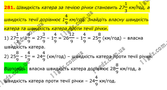 Швидкість катера за течією річки становить 271/3 км/год, а швидкість течії дорівнює 14/9 км/год. Знайдіть власну швидкість катера та швидкість катера проти течії річки. 1) 271/3 – 14/9 = 273/9 – 14/9 = 2612/9 – 14/9 = 258/9 (км/год) – власна швидкість катера. 2) 258/9 – 14/9 = 244/9 (км/год) – швидкість катера проти течії річки. Відповідь: власна швидкість катера дорівнює 288/9 км/год, а швидкість катера проти течії річки – 244/9 км/год.
