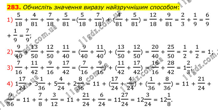 Обчисліть значення виразу найзручнішим способом: 1) 5/18 + 4/81 + 7/18 + 5/81 =(5/18 + 7/18) + (4/81 + 5/81) = 12/18 + 9/81 = 2/3 + 1/9 = 6/9 + 1/9 = 7/9; 2) 9/40 + 13/50 + 12/50 + 11/40 = (9/40 + 11/40) + (13/50 + 12/50) = 20/40 + 25/50 = 1/2 + 1/2 = 1; 3) 7/16 + 11/42 + 9/16 + 17/42 = (7/16 + 9/16) + (11/42 + 17/42) = 16/16 + 28/42 = 12/3; 4) 117/24 + 31/36 + 54/24 + 28/36 = 11 + (17/24 + 4/24) + (1/36 + 8/36) = 11 + 21/24 + 9/36 = 11 + 7/8 + 3/12 = 11 + 21/24 + 6/24 = 1127/24 = 123/24 = 121/8.
