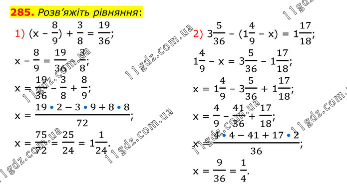 Розв’яжіть рівняння: 1) (х – 8/9) + 3/8 = 19/36; х – 8/9 = 19/36 – 3/8; х = 19/36 – 3/8 + 8/9; х = (19 • 2 - 3 • 9 + 8 • 8)/72; х = 75/72 = 25/24 = 11/24. 2) 35/36 – (14/9 – х) = 117/18; 14/9 – х = 35/36 – 117/18; х = 14/9 – 35/36 + 117/18; х = 4/9 – 41/36 + 17/18; х = (4 • 4 - 41 + 17 • 2)/36; х = 9/36 = 1/4.