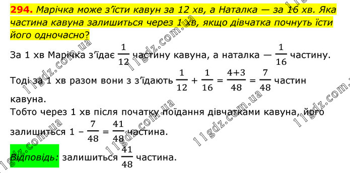 Марічка може з’їсти кавун за 12 хв, а Наталка — за 16 хв. Яка частина кавуна залишиться через 1 хв, якщо дівчатка почнуть їсти його одночасно? За 1 хв Марічка з’їдає 1/12 частину кавуна, а наталка — 1/16 частину. Тоді за 1 хв разом вони з з’їдають 1/12 + 1/16 = (4+3)/48 = 7/48 частин кавуна. Тобто через 1 хв після початку поїдання дівчатками кавуна, його залишиться 1 – 7/48 = 41/48 частина. Відповідь: залишиться 41/48 частина.