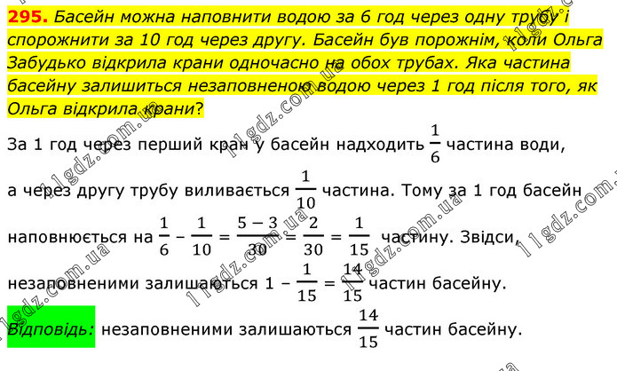 Басейн можна наповнити водою за 6 год через одну трубу і спорожнити за 10 год через другу. Басейн був порожнім, коли Ольга Забудько відкрила крани одночасно на обох трубах. Яка частина басейну залишиться незаповненою водою через 1 год після того, як Ольга відкрила крани? За 1 год через перший кран у басейн надходить 1/6 частина води, а через другу трубу виливається 1/10 частина. Тому за 1 год басейн наповнюється на 1/6 – 1/10 = (5 - 3)/30 = 2/30 = 1/15 частину. Звідси, незаповненими залишаються 1 – 1/15 = 14/15 частин басейну. Відповідь: незаповненими залишаються 14/15 частин басейну.