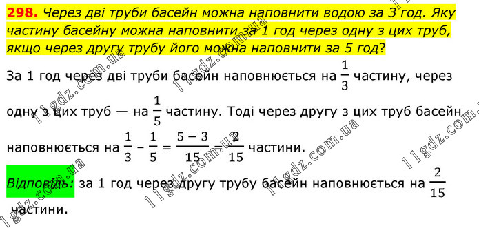 Через дві труби басейн можна наповнити водою за З год. Яку частину басейну можна наповнити за 1 год через одну з цих труб, якщо через другу трубу його можна наповнити за 5 год? За 1 год через дві труби басейн наповнюється на 1/3 частину, через одну з цих труб — на 1/5 частину. Тоді через другу з цих труб басейн наповнюється на 1/3 – 1/5 = (5 - 3)/15 = 2/15 частини. Відповідь: за 1 год через другу трубу басейн наповнюється на 2/15 частини.