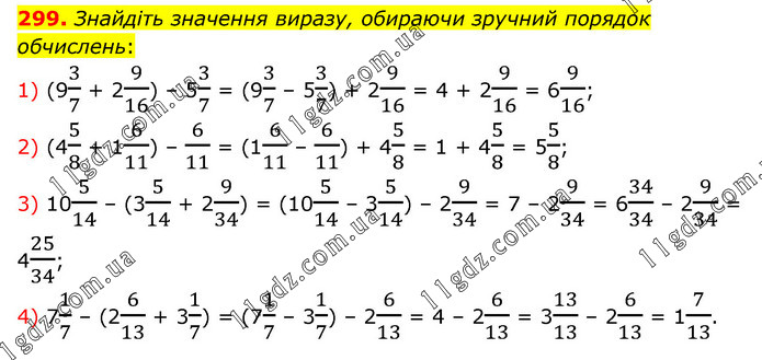 Знайдіть значення виразу, обираючи зручний порядок обчислень: 1) (93/7 + 29/16) – 53/7 = (93/7 – 53/7) + 29/16 = 4 + 29/16 = 69/16; 2) (45/8 + 16/11) – 6/11 = (16/11 – 6/11) + 45/8 = 1 + 45/8 = 55/8; 3) 105/14 – (35/14 + 29/34) = (105/14 – 35/14) – 29/34 = 7 – 29/34 = 634/34 – 29/34 = 425/34; 4) 71/7 – (26/13 + 31/7) = (71/7 – 31/7) – 26/13 = 4 – 26/13 = 313/13 – 26/13 = 17/13.