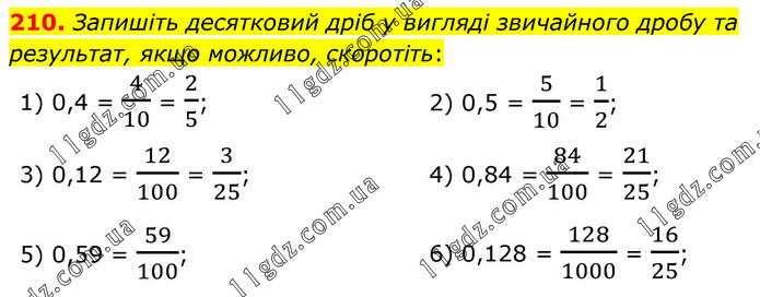 Запишіть десятковий дріб у вигляді звичайного дробу та результат, якщо можливо, скоротіть: 1) 0,4 = 4/10 = 2/5; 2) 0,5 = 5/10 = 1/2; 3) 0,12 = 12/100 = 3/25; 4) 0,84 = 84/100 = 21/25; 5) 0,59 = 59/100; 6) 0,128 = 128/1000 = 16/25;