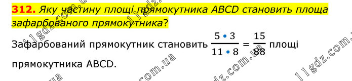 Яку частину площі прямокутника ABCD становить площа зафарбованого прямокутника? Зафарбований прямокутник становить (5 • 3)/(11 • 8) = 15/88 площі прямокутника ABCD.
