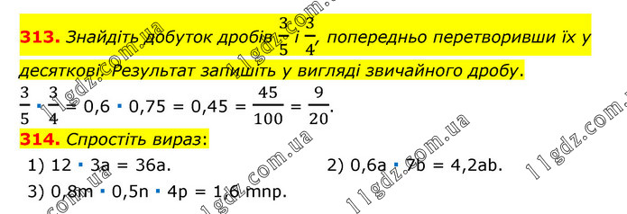 313. Знайдіть добуток дробів 3/5 і 3/4, попередньо перетворивши їх у десяткові. Результат запишіть у вигляді звичайного дробу. 3/5 ∙ 3/4 = 0,6 ∙ 0,75 = 0,45 = 45/100 = 9/20. 314. Спростіть вираз: 1) 12 ∙ 3a = 36a. 2) 0,6a ∙ 7b = 4,2ab. 3) 0,8m ∙ 0,5n ∙ 4p = 1,6 mnp.