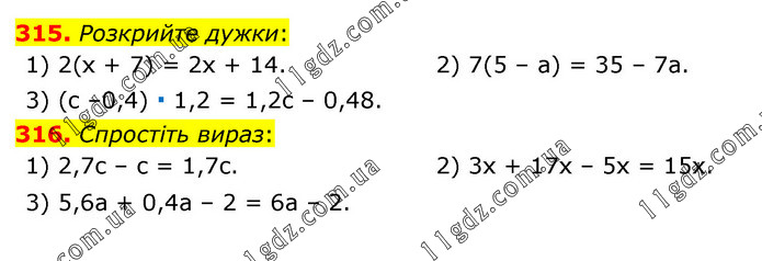315. Розкрийте дужки: 1) 2(x + 7) = 2x + 14. 2) 7(5 – a) = 35 – 7a. 3) (c –0,4) ∙ 1,2 = 1,2c – 0,48. 316. Спростіть вираз: 1) 2,7c – c = 1,7c. 2) 3x + 17x – 5x = 15x. 3) 5,6a + 0,4a – 2 = 6a – 2.