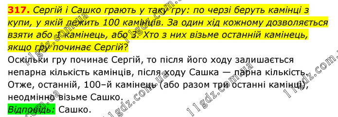 Сергій і Сашко грають у таку гру: по черзі беруть камінці з купи, у якій лежить 100 камінців. За один хід кожному дозволяється взяти або 1 камінець, або 3. Хто з них візьме останній камінець, якщо гру починає Сергій? Оскільки гру починає Сергій, то після його ходу залишається непарна кількість камінців, після ходу Сашка — парна кількість. Отже, останній, 100–й камінець (або разом три останні камінці), неодмінно візьме Сашко. Відповідь: Сашко.
