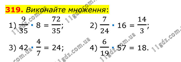 Виконайте множення: 1) 9/35 ∙ 8 = 72/35; 2) 7/24 ∙ 16 = 14/3; 3) 42 ∙ 4/7 = 24; 4) 6/19 ∙ 57 = 18.