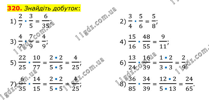 Знайдіть добуток: 1) 2/7 ∙ 3/5 = 6/35; 2) 3/4 ∙ 5/6 = 5/8; 3) 4/7 ∙ 7/9 = 4/9; 4) 15/16 ∙ 48/55 = 9/11; 5) 22/25 ∙ 10/77 = (2 • 2)/(5 • 5) = 4/25; 6) 13/24 ∙ 16/39 = (1 • 2)/(3 • 3) = 2/9; 7) 6/35 ∙ 14/15 = (2 • 2)/(5 • 5) = 4/25; 8) 36/85 ∙ 34/39 = (12 • 2)/(5 • 13) = 24/65.