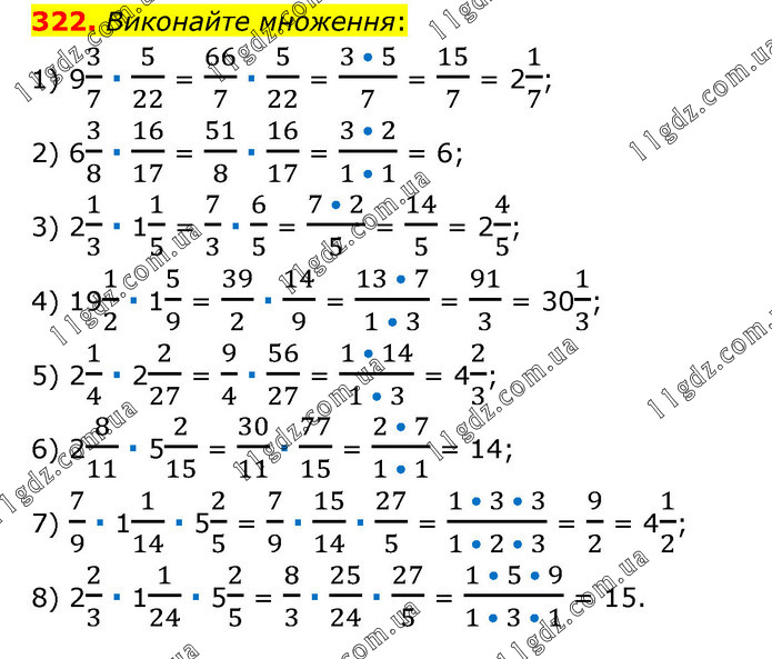 Виконайте множення: 1) 93/7 ∙ 5/22 = 66/7 ∙ 5/22 = (3 • 5)/7 = 15/7 = 21/7; 2) 63/8 ∙ 16/17 = 51/8 ∙ 16/17 = (3 • 2)/(1 • 1) = 6; 3) 21/3 ∙ 11/5 = 7/3 ∙ 6/5 = (7 • 2)/5 = 14/5 = 24/5; 4) 191/2 ∙ 15/9 = 39/2 ∙ 14/9 = (13 • 7)/(1 • 3) = 91/3 = 301/3; 5) 21/4 ∙ 22/27 = 9/4 ∙ 56/27 = (1 • 14)/(1 • 3) = 42/3; 6) 28/11 ∙ 52/15 = 30/11 ∙ 77/15 = (2 • 7)/(1 • 1) = 14; 7) 7/9 ∙ 11/14 ∙ 52/5 = 7/9 ∙ 15/14 ∙ 27/5 = (1 • 3 • 3)/(1 • 2 • 3) = 9/2 = 41/2; 8) 22/3 ∙ 11/24 ∙ 52/5 = 8/3 ∙ 25/24 ∙ 27/5 = (1 • 5 • 9)/(1 • 3 • 1) = 15.