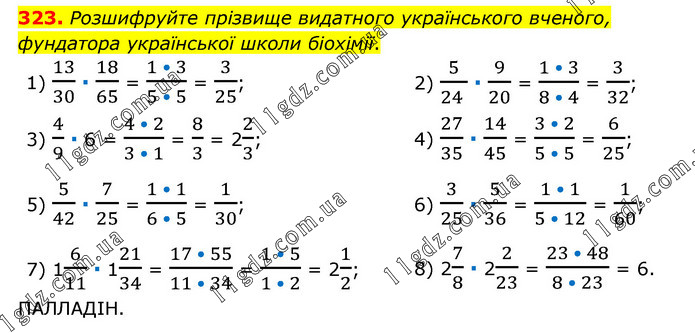 Розшифруйте прізвище видатного українського вченого, фундатора української школи біохімії. 1) 13/30 ∙ 18/65 = (1 • 3)/(5 • 5) = 3/25; 2) 5/(24 ) ∙ 9/20 = (1 • 3)/(8 • 4) = 3/32; 3) 4/9 ∙ 6 = (4 • 2)/(3 • 1) = 8/3 = 22/3; 4) 27/35 ∙ 14/45 = (3 • 2)/(5 • 5) = 6/25; 5) 5/42 ∙ 7/25 = (1 • 1)/(6 • 5) = 1/30; 6) 3/25 ∙ 5/36 = (1 • 1)/(5 • 12) = 1/60; 7) 16/11 ∙ 121/34 = (17 • 55)/(11 • 34) = (1 • 5)/(1 • 2) = 21/2; 8) 27/8 ∙ 22/23 = (23 • 48)/(8 • 23) = 6.