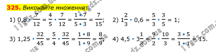 Виконайте множення: 1) 0,8 ∙ 7/12 = 4/5 ∙ 7/12 = (1 • 7)/(5 • 3) = 7/15; 2) 12/3 ∙ 0,6 = 5/3 ∙ 3/5 = 1; 3) 1,25 ∙ 32/45 = 5/4 ∙ 32/45 = (1 • 8)/(1 • 9) = 8/9; 4) 4,5 ∙ 31/3 = 9/2 ∙ 10/3 = (3 • 5)/(1 • 1) = 15.