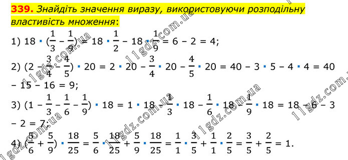 Знайдіть значення виразу, використовуючи розподільну властивість множення: 1) 18 ∙ (1/3 – 1/9) = 18 ∙ 1/2 – 18 ∙ 1/9 = 6 – 2 = 4; 2) (2 – 3/4 – 4/5) ∙ 20 = 2 ∙ 20 – 3/4 ∙ 20 – 4/5 ∙ 20 = 40 – 3 ∙ 5 – 4 ∙ 4 = 40 – 15 – 16 = 9; 3) (1 – 1/3 – 1/6 – 1/9) ∙ 18 = 1 ∙ 18 – 1/3 ∙ 18 – 1/6 ∙ 18 – 1/9 ∙ 18 = 18 – 6 – 3 – 2 = 7; 4) (5/6 + 5/9) ∙ 18/25 = 5/6 ∙ 18/25 + 5/9 ∙ 18/25 = 1/1 ∙ 3/5 + 1/1 ∙ 2/5 = 3/5 + 2/5 = 1.