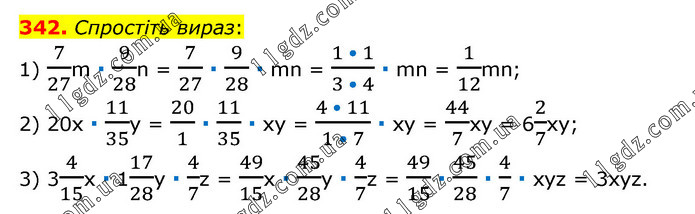 Спростіть вираз: 1) 7/27m ∙ 9/28n = 7/27 ∙ 9/28 ∙ mn = (1 • 1)/(3 • 4) ∙ mn = 1/12mn; 2) 20x ∙ 11/35y = 20/1 ∙ 11/35 ∙ xy = (4 • 11)/(1 • 7) ∙ xy = 44/7xy = 62/7xy; 3) 34/15x ∙ 117/28y ∙ 4/7z = 49/15x ∙ 45/28y ∙ 4/7z = 49/15 ∙ 45/28 ∙ 4/7 ∙ xyz = 3xyz.