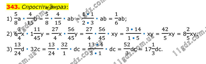 Спростіть вираз: 1) 5/8a ∙ 4/15b = 5/8 ∙ 4/15 ∙ ab = (1 • 1)/(2 • 3) ∙ ab = 1/6ab; 2) 63/4x ∙ 111/45y = 27/4x ∙ 56/45y = 27/4 ∙ 56/45 ∙ xy = (3 • 14)/(1 • 5) ∙ xy = 42/5xy = 82/5xy; 3) 13/24d ∙ 32c = 13/24 ∙ 32/1 ∙ dc = (13 • 4)/(3 • 1) ∙ dc = 52/3dc = 171/3dc.
