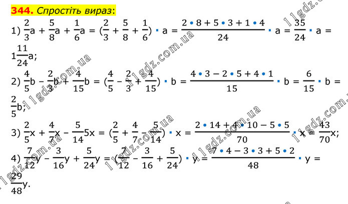 Спростіть вираз: 1) 2/3a + 5/8a + 1/6a = (2/3 + 5/8 + 1/6) ∙ a = (2 • 8 + 5 • 3 + 1 • 4)/24 ∙ a = 35/24 ∙ a = 111/24a; 2) 4/5b – 2/3b + 4/15b = (4/5 – 2/3 + 4/15) ∙ b = (4 • 3 - 2 • 5 + 4 • 1)/15 ∙ b = 6/15 ∙ b = 2/5b; 3) 2/5x + 4/7x – 5/145x = (2/5 + 4/7 – 5/14) ∙ x = (2 • 14 + 4 • 10 - 5 • 5)/70 ∙ x = 43/70x; 4) 7/12y – 3/16y + 5/24y = (7/12 – 3/16 + 5/24) ∙ y = (7 • 4 - 3 • 3 + 5 • 2)/48 ∙ y = 29/48y.